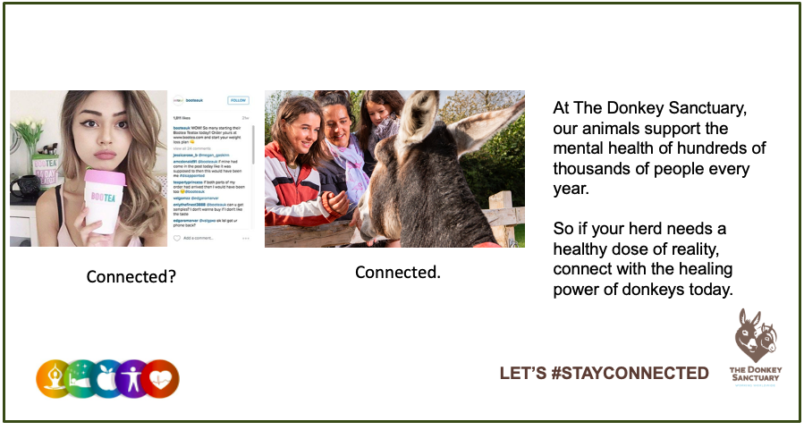 It’s a little-known fact that donkeys are hugely intuitive and emotionally intelligent, with limbic systems very similar to our own. Because donkeys are highly attuned to human emotions, they bring great concordance and healing power to those who spend time in their presence. Using this science, The Donkey Sanctuary aids troubled people in finding personal ease and inner peace, helping to turn thousands of lives around every year.